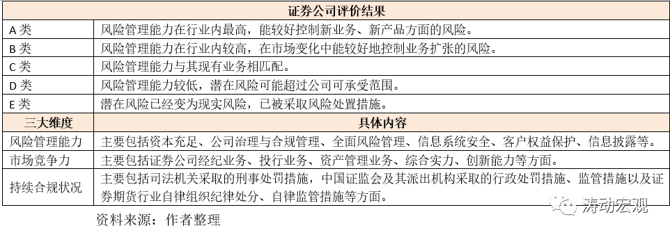 3、證券公司分類結(jié)果將作為證券公司申請(qǐng)?jiān)黾訕I(yè)務(wù)種類、新設(shè)營(yíng)業(yè)網(wǎng)點(diǎn)、發(fā)行上市等事項(xiàng)的審慎性條件,并將作為確定新業(yè)務(wù)、新產(chǎn)品試點(diǎn)范圍和推廣順序的依據(jù),因此對(duì)于券商本身而言極其重要。同時(shí)不同級(jí)別的證券公司繳納證券投資者保護(hù)基金的比例也有所不同。對(duì)評(píng)判公司的評(píng)價(jià)主要分為風(fēng)險(xiǎn)管理能力、市場(chǎng)競(jìng)爭(zhēng)力和持續(xù)合規(guī)狀況等三大維度。而從評(píng)價(jià)結(jié)果來看,具體如下,