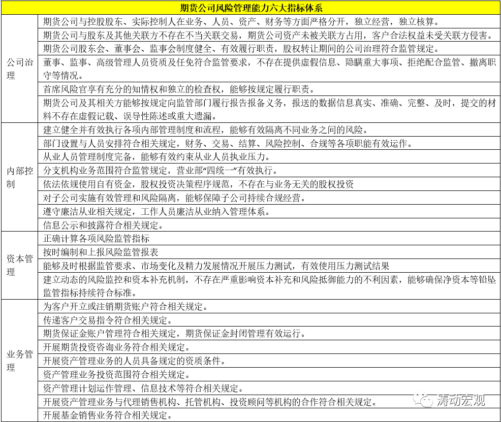 5、風(fēng)險(xiǎn)管理能力是期貨公司四大維度的引領(lǐng)部分,包括公司治理、內(nèi)部控制、資本管理、業(yè)務(wù)管理、客戶管理、信息技術(shù)管理等6類評(píng)價(jià)指標(biāo).