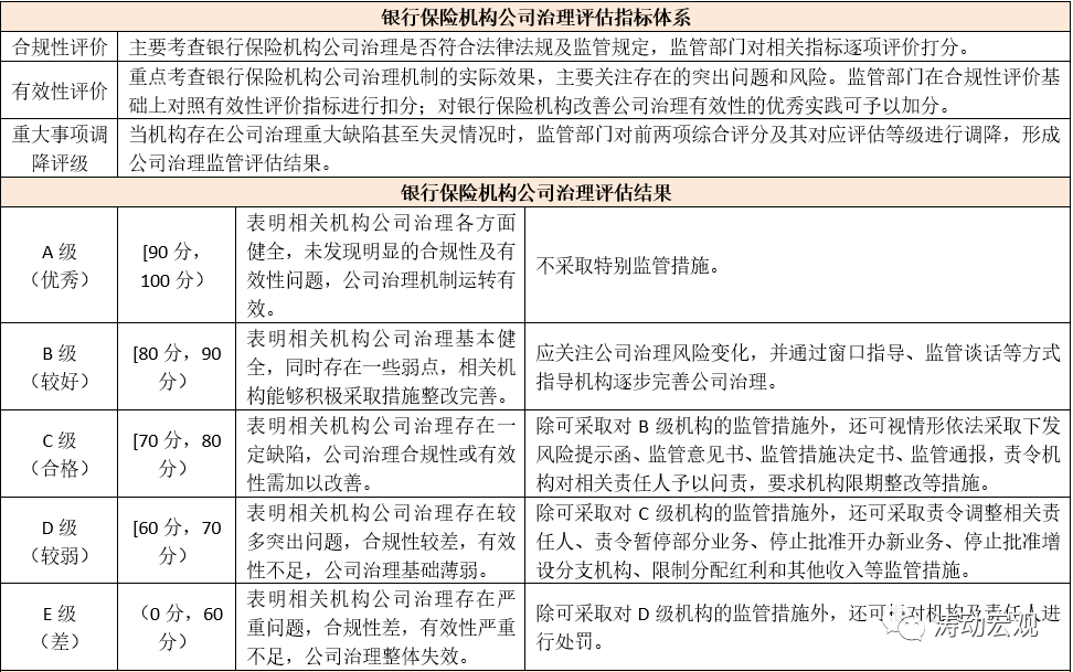1、對(duì)銀行保險(xiǎn)機(jī)構(gòu)公司治理的監(jiān)管評(píng)估主要依據(jù)2019年11月29日銀保監(jiān)會(huì)發(fā)布的《銀行保險(xiǎn)機(jī)構(gòu)公司治理監(jiān)管評(píng)估辦法(試行)》(銀保監(jiān)發(fā)〔2019〕43號(hào)),該評(píng)級(jí)主要針對(duì)全國(guó)性銀行、城商行、民營(yíng)銀行、農(nóng)商行、外資銀行、保險(xiǎn)集團(tuán)(控股)公司、保險(xiǎn)公司、相互保險(xiǎn)社及自保公司,評(píng)估內(nèi)容主要包括黨的領(lǐng)導(dǎo)、股東治理、董事會(huì)治理、監(jiān)事會(huì)和高管層治理、風(fēng)險(xiǎn)內(nèi)控、關(guān)聯(lián)交易治理、市場(chǎng)約束、其他利益相關(guān)者治理等方面。