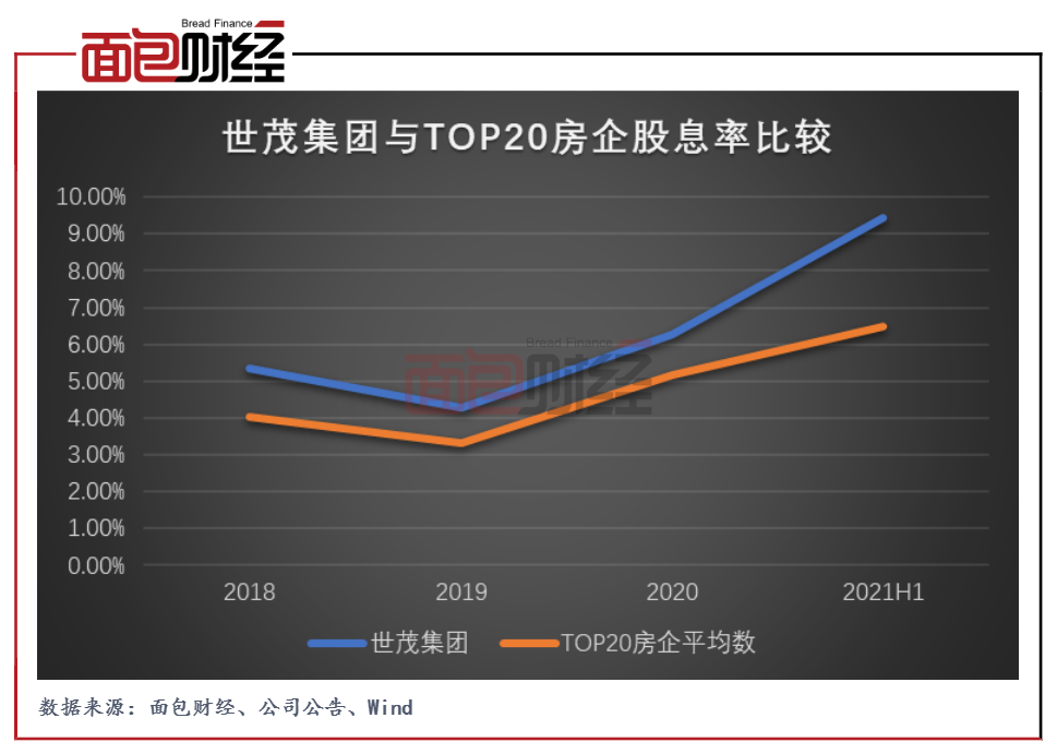 不僅分紅穩定,世茂集團的股息率在同行中處于較高水平。2021年上半年,世茂集團股息率為9.45%,高出TOP20房企平均股息率約3個百分點。于2021年8月,世茂集團被納入首期恒生滬深港(特選企業)高股息率指數。