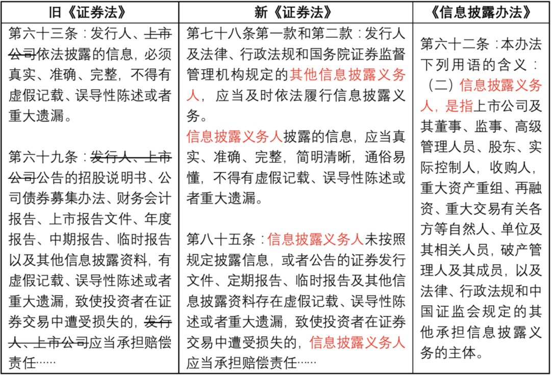 有鑒于此,新《證券法》引入了“信息披露義務人”概念,建立起以“信息披露義務人”為中心的監管原則,由此只要是法律、行政法規、國務院證券監督管理機構等規定的信息披露義務人,均負有直接的信息披露義務,并承擔相應的行政、民事乃至刑事責任。而《信息披露辦法》為進一步明晰義務主體,直接在“附則”中詳細規定了信息披露義務人的范圍。[3]