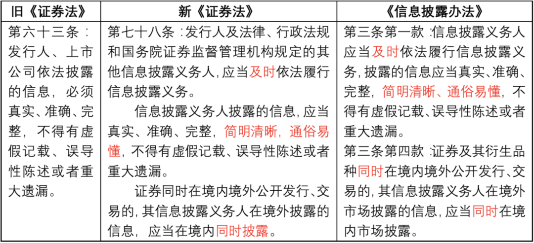 新《證券法》及《信息披露辦法》在舊《證券法》“真實、準確、完整”信披基本要求基礎之上,新增了“及時、簡明清晰、通俗易懂、同步”等信披的基本要求。具體而言: