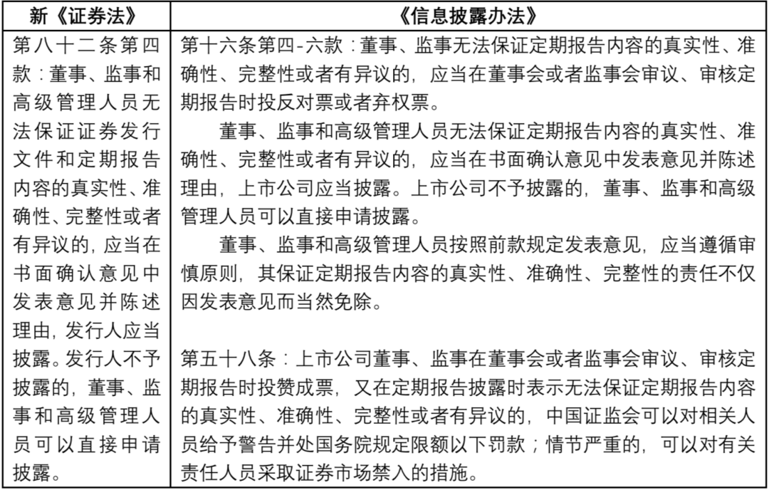 考慮到發行人董監高較高的職業風險和權限范圍,基于保障董監高合法權益,新《證券法》第八十二條第四款,在《上市公司信息披露管理辦法(2007年)》第二十四條第二款等規定基礎之上,新增了董監高的信息披露異議制度,即董監高在無法保證發行文件和定期報告內容真實、準確、完整或存在異議時,應當書面確認意見并陳述理由,發行人應予披露,發行人不披露的,董監高可申請披露。董監高異議披露制度也是發現證券市場虛假陳述等違法行為的有效措施之一。[12]