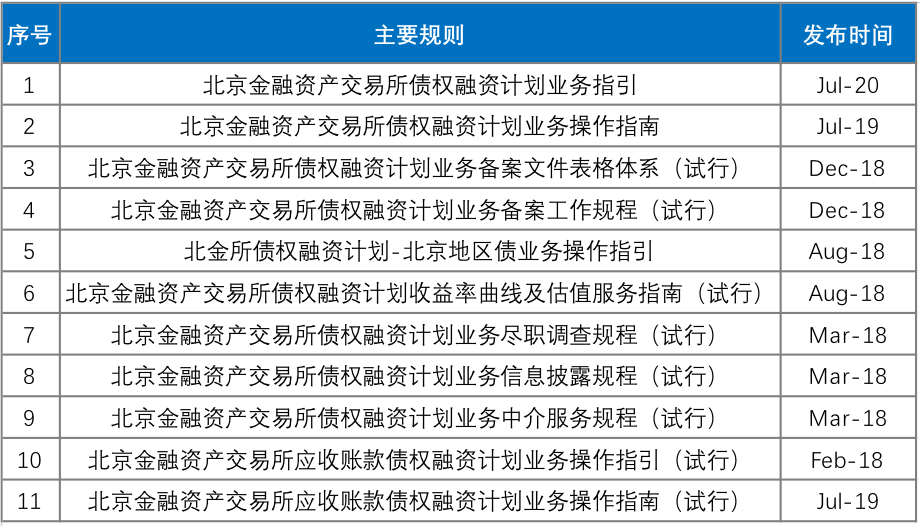 我國與債權融資計劃相關的法律法規其實很有限,主要政策依據是中國人民銀行辦公廳《關于北京金融資產交易所成為中國銀行間市場交易商協會指定交易平臺的意見》(銀辦函【2013】399號)以及交易商協會《關于同意<北京金融資產交易所債權融資計劃業務指引>備案的通知》(中市協發【2017】70號)。2017年6月,在《北京金融資產交易所債權融資計劃業務指引》(以下簡稱“《業務指引》”)首次對外發布后,債權融資計劃才具備明確的操作依據。