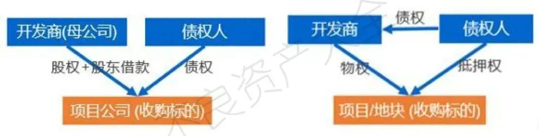如上左圖,投資人愿意收購項目公司股權的同時收購項目公司的債權(股東借款)。或者如右圖,投資人收購標的地塊同時,幫助債務人(開發(fā)商)清償債務以解除標的地塊的權利障礙(抵押權等)。在將項目公司或標的地塊收購并清除權利障礙后,或開發(fā)后銷售回款,或直接出售給其他開發(fā)商。