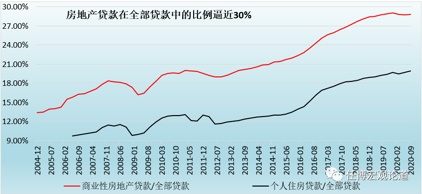 截至2020年9月,金融機(jī)構(gòu)房地產(chǎn)貸款余額達(dá)到48.80萬(wàn)億元,其中個(gè)人住房貸款余額達(dá)到33.70萬(wàn)億,分別占金融機(jī)構(gòu)全部貸款余額的28.81%和19.90%。因此大致可以認(rèn)為金融機(jī)構(gòu)的房地產(chǎn)貸款余額已經(jīng)逼近50萬(wàn)億元,吸納了全部信貸資源的30%左右,且個(gè)人住房貸款占全部房地產(chǎn)貸款的70%左右。