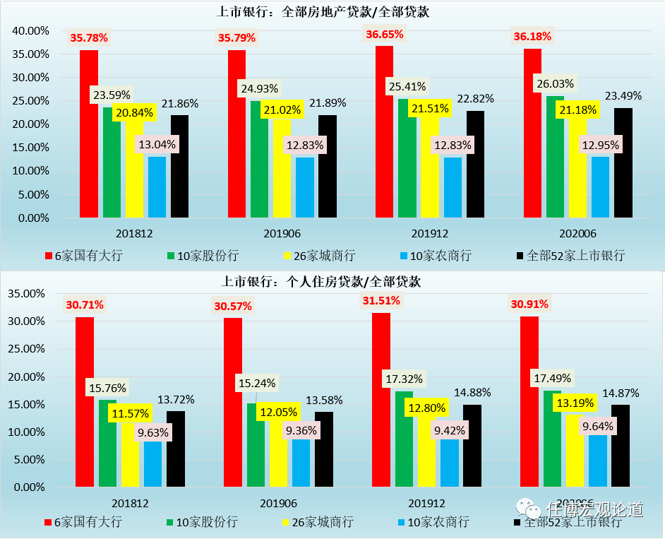 (1)截至2020年6月,6家國(guó)有大行的房地產(chǎn)貸款占比高達(dá)36.18%,2018年與2019年分別為35.78%和36.65%,整體上一直保持36%上的高位。