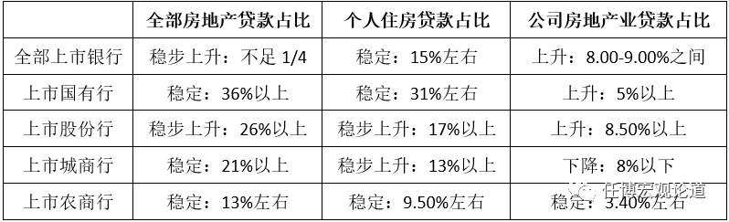 (六)322號(hào)文僅提及個(gè)人住房貸款和全部房地產(chǎn)貸款,同時(shí)從比例設(shè)置來(lái)看,第一檔(國(guó)有行)、第二檔(包括3家城商行的中型銀行)、第三檔的對(duì)公端房地產(chǎn)貸款占比上限分別應(yīng)不低于7.50%、7.50%和5%,第四檔與第五檔的對(duì)公端房地產(chǎn)貸款占比上限亦分別應(yīng)不低于5%。因此我們大致可以這樣理解,322號(hào)文同時(shí)對(duì)個(gè)人住房貸款和對(duì)公端房地產(chǎn)業(yè)貸款比例提出了具體約束要求。