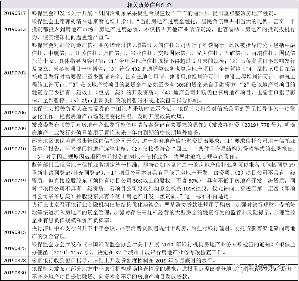 2、2019年政策層面對(duì)房地產(chǎn)業(yè)務(wù)的嚴(yán)監(jiān)管始于中美貿(mào)易摩擦形勢(shì)開(kāi)始明顯惡化(2019年5月5日)、包商銀行被接管以及貨幣政策層面再次放松之后,而2019年6月13日銀保監(jiān)會(huì)主席郭樹(shù)清在陸家嘴論壇上提示房地產(chǎn)金融業(yè)務(wù)風(fēng)險(xiǎn)這一事件則正式拉開(kāi)了房地產(chǎn)行業(yè)嚴(yán)監(jiān)管的大幕,隨后整個(gè)7月份的房地產(chǎn)政策監(jiān)管信息便比較集中,主要體現(xiàn)在房地產(chǎn)信托融資、房企境外發(fā)債等等。