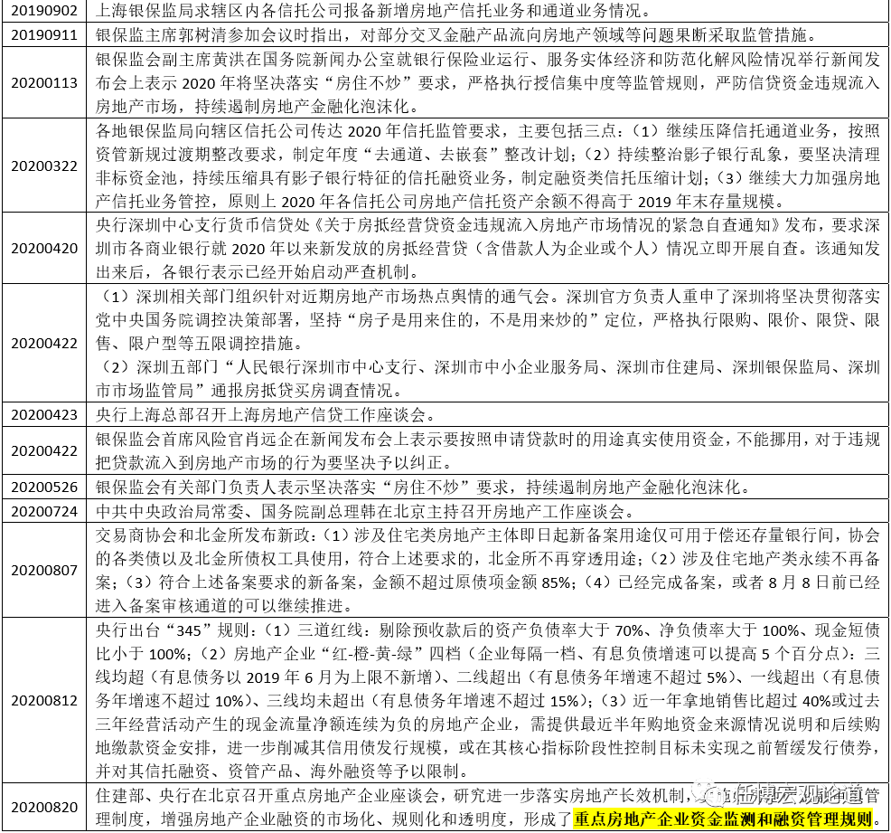 3、在2019年以來(lái)對(duì)房地產(chǎn)信托融資渠道進(jìn)行約束后,2020年以來(lái)對(duì)房地產(chǎn)的融資渠道和有息債務(wù)進(jìn)行嚴(yán)控,整體上看管控力度較2019年明顯更強(qiáng),致力于從根本上形成重點(diǎn)房地產(chǎn)企業(yè)資金監(jiān)測(cè)和融資管理規(guī)則,推動(dòng)房地產(chǎn)企業(yè)融資的透明化,便于防范房地產(chǎn)企業(yè)風(fēng)險(xiǎn)。2019年以來(lái)具體量化指標(biāo)約束如下: