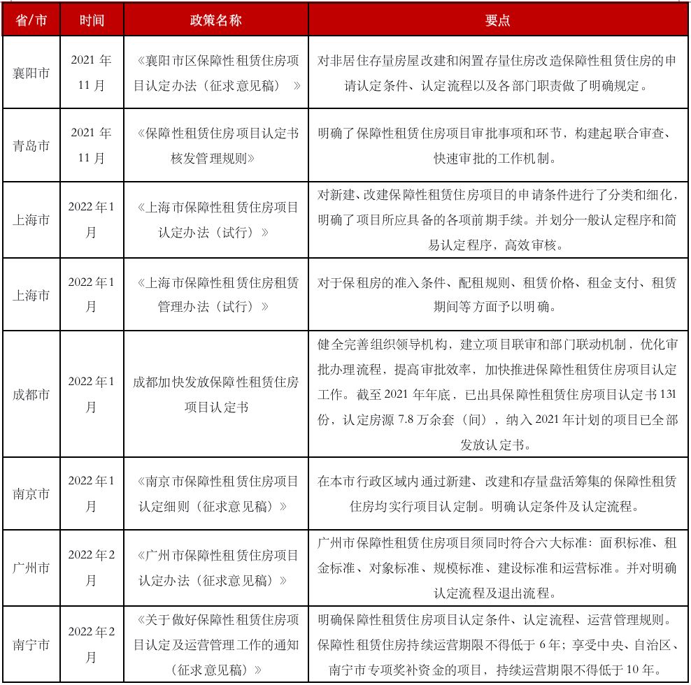 為加快保租房籌建進度和規(guī)范保租房市場健康穩(wěn)定發(fā)展,上海、廣州、南京、青島等城市陸續(xù)發(fā)布保障性租賃住房項目認定辦法與管理辦法,明確保障性租賃住房項目準入條件、運營標準、退出規(guī)則以及審批事項和環(huán)節(jié)等,構(gòu)建聯(lián)合審查、快速審批的工作機制,確保“十四五”保障性租賃住房目標按時保質(zhì)保量完成。