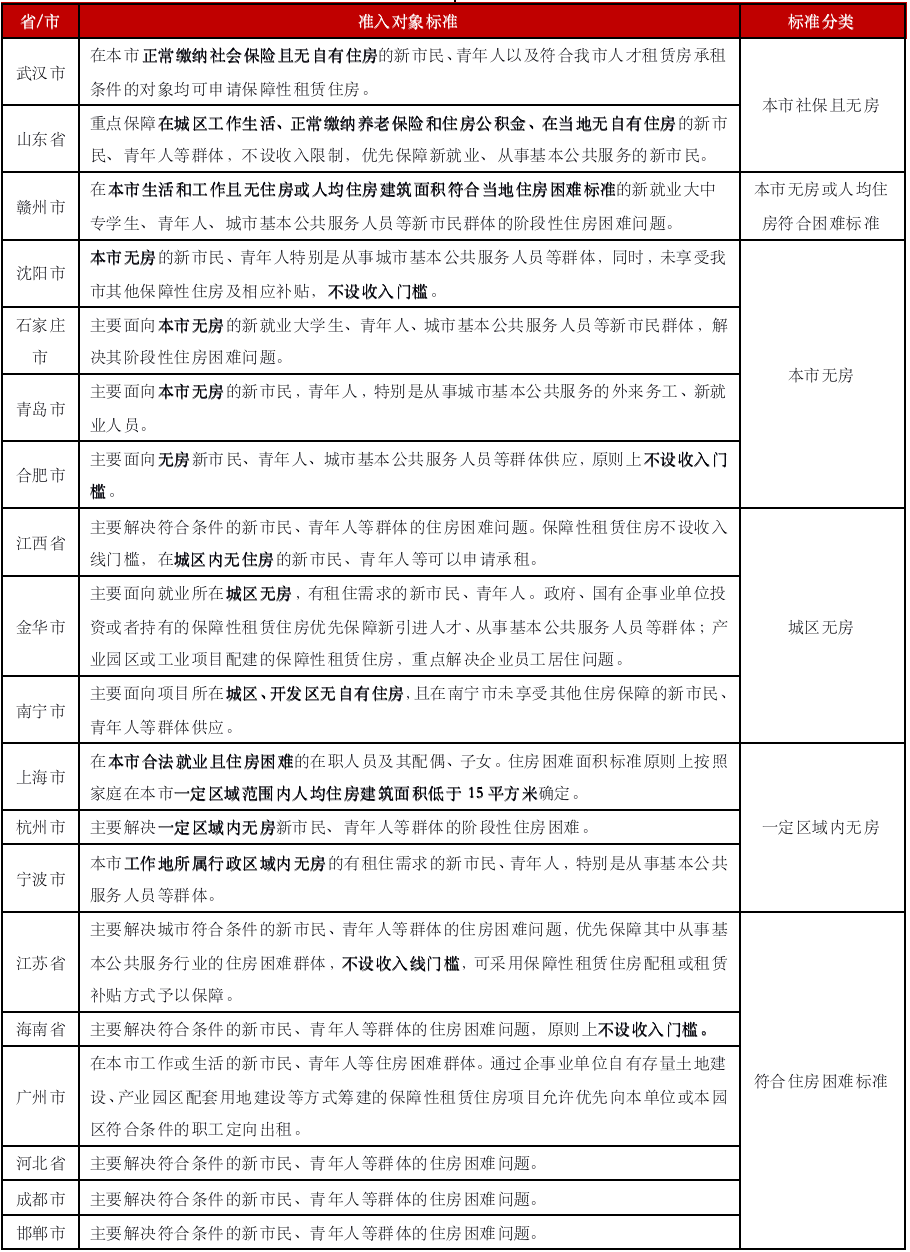 對象標準:關于保障性租賃住房準入對象上各城市存在較大差異,具體可以分為本市社保+無房、本市無房、城區(qū)無房、一定區(qū)域內(nèi)無房、符合住房困難標準五大類。