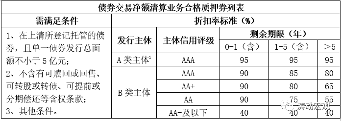 (1)2016年8月24日,上清所發布的《債券交易凈額清算業務質押式回購質押券管理規程》明確上清所負責設定可納入通用質押券業務的合資格債券標準,合資格債券折扣率根據主體信用水平、債券剩余期限、價格波動和市場流動性等設定。其中,質押券價值=債券總面額累計*全價估值*折扣率/百元剩余本金。