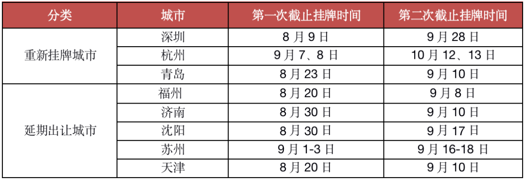 值得注意的是,由于土拍規(guī)則調(diào)整,第二次集中供地過(guò)程中,多城土地延期出讓或重新掛牌,譬如深圳、杭州、青島均停止掛牌之后重新掛牌,福州、濟(jì)南、沈陽(yáng)、蘇州和天津等城市均延期出讓。就出讓時(shí)間來(lái)看,很多本該8月集中土拍的城市被擠壓至9月、10月。