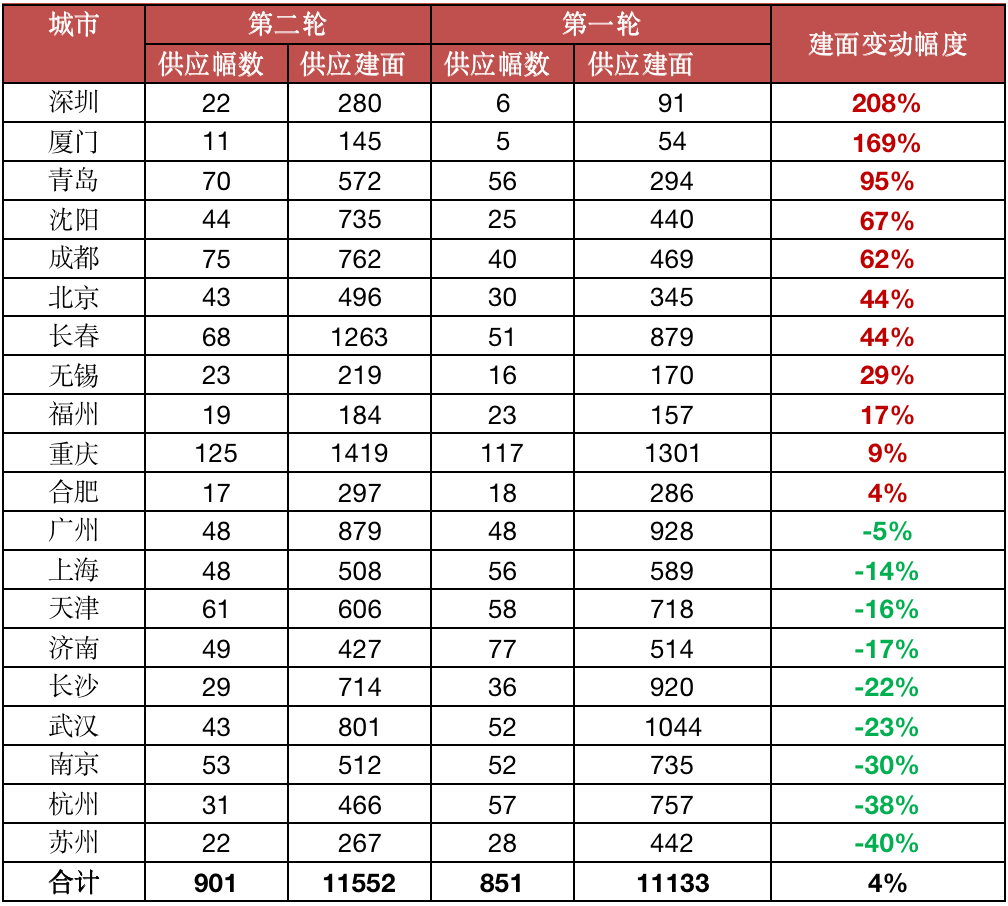 具體各城市間分化較為顯著。其中,蘇州、杭州、南京、武漢、長(zhǎng)沙等城市第二輪供地規(guī)模較首輪明顯下滑,降幅均超20%;其他城市較首輪均有明顯上漲,尤其是深圳、廈門、青島等地,供應(yīng)規(guī)模均實(shí)現(xiàn)翻番。