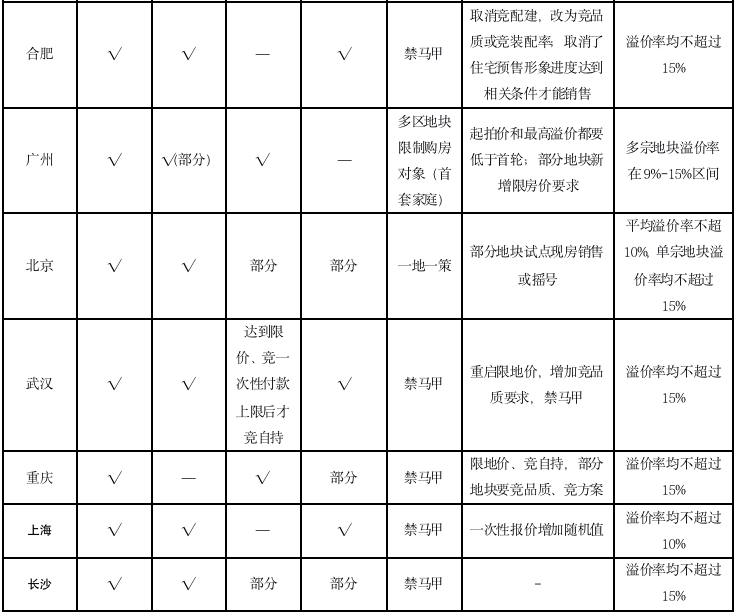 一是更多采用“限價(jià)+搖號(hào)”方式進(jìn)行土地競(jìng)拍,并且溢價(jià)率均有明顯下調(diào)。典型如廣州、南京、杭州、合肥等城市,溢價(jià)率上限均調(diào)整為15%;