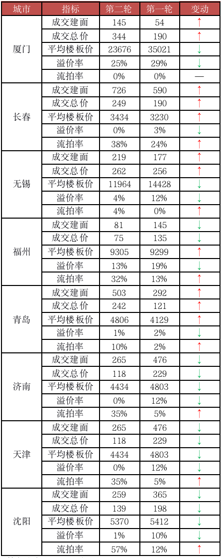 對(duì)比首輪集中土拍熱度來(lái)看,所有城市二輪集中土拍熱度均有所下滑:成交溢價(jià)率均較首輪有所降低,尤其是濟(jì)南、天津等低熱城市,溢價(jià)率降幅均在十個(gè)百分點(diǎn)以上;除廈門外,其余七市二輪流拍率均大幅走高,沈陽(yáng)、長(zhǎng)春、福州、濟(jì)南和天津等城市二輪土地出讓流拍率均超過(guò)了30%。