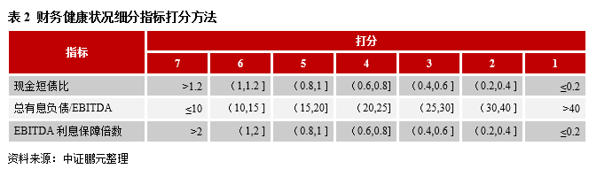 (3)“財務(wù)健康狀況”用于反映城投公司因不合理的財務(wù)杠桿所引起的財務(wù)風(fēng)險程度,主要通過現(xiàn)金短債比、總有息負(fù)債/EBITDA、EBITDA利息保障倍數(shù)來考察。其中,“現(xiàn)金短債比”反映城投公司現(xiàn)金類資產(chǎn)對短期有息債務(wù)的覆蓋倍數(shù),計算公式為:(貨幣資金+應(yīng)收票據(jù)+交易性金融資產(chǎn))/短期有息債務(wù);“總有息債務(wù)/EBITDA”和“EBITDA利息保障倍數(shù)”反映城投公司EBITDA 對債務(wù)本息的保障程度。對城投違約的影響方向上,現(xiàn)金短債比、EBITDA利息保障倍數(shù)的數(shù)值越大,城投違約概率越小;總有息負(fù)債/EBITDA的數(shù)值越大,城投違約概率越大。