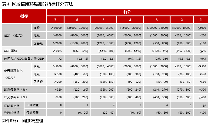 (2)“區(qū)域信用環(huán)境”用于反映城投公司所屬區(qū)域的地方政府經(jīng)濟(jì)財政實力、區(qū)域債務(wù)風(fēng)險及處置情況,主要通過“地方GDP及增速”、“地區(qū)人均GDP/全國人均GDP”、“公共財政收入”、“政府債務(wù)率”、“廣義債務(wù)率”、“區(qū)域國企債券違約情況”等來考察,其中“政府債務(wù)率”也即法定債務(wù)率,計算公式為:政府債務(wù)余額/綜合財力,其中政府債務(wù)余額=一般債務(wù)余額+專項債務(wù)余額,綜合財力=一般公共預(yù)算財力+政府性基金預(yù)算財力。根據(jù)財政部的地方政府債務(wù)風(fēng)險評定等級制度,政府債務(wù)率按照“≧300%”、“(200%,300% ]”、“(120%,200% ]”、“<120%”分別設(shè)為“紅”“橙”“黃”“綠”四檔;“廣義債務(wù)率”特指轄區(qū)內(nèi)城投公司總有息負(fù)債/公共財政收入,不同于政府債務(wù)率,也不同于各地方政府測算、披露的全口徑債務(wù)率(也稱綜合債務(wù)率,計算公式為全口徑債務(wù)余額/綜合財力,需注意的是全口徑債務(wù)余額包括顯性債務(wù)和隱性債務(wù));“區(qū)域國企債券違約情況”是區(qū)域所屬省份地方國企發(fā)生債券違約的主體數(shù)量/債券規(guī)模。對城投違約的影響方向上,“地方GDP及增速”、“地區(qū)人均GDP/全國人均GDP”、“公共財政收入”的數(shù)值越大,則城投違約的概率越小,“政府債務(wù)率”、“廣義債務(wù)率”、“區(qū)域國企債券違約情況”的數(shù)值越大,則城投違約的概率越大。