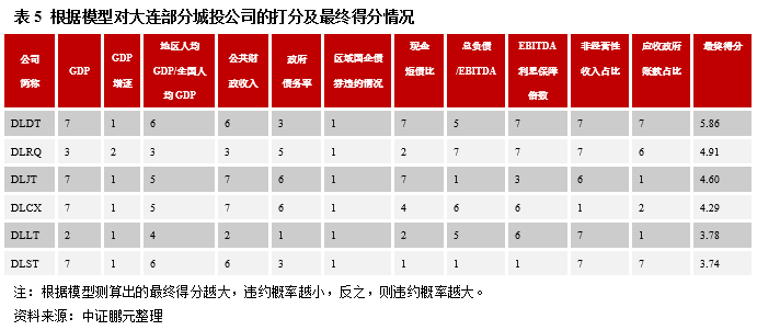 本小節(jié)將以“城投四大天王”之一的大連為例,將數(shù)據(jù)可得性較好的、尚有存續(xù)債券的6家城投公司作為樣本,運用模型推導(dǎo)出相應(yīng)的結(jié)論,具體測算結(jié)果見下表。