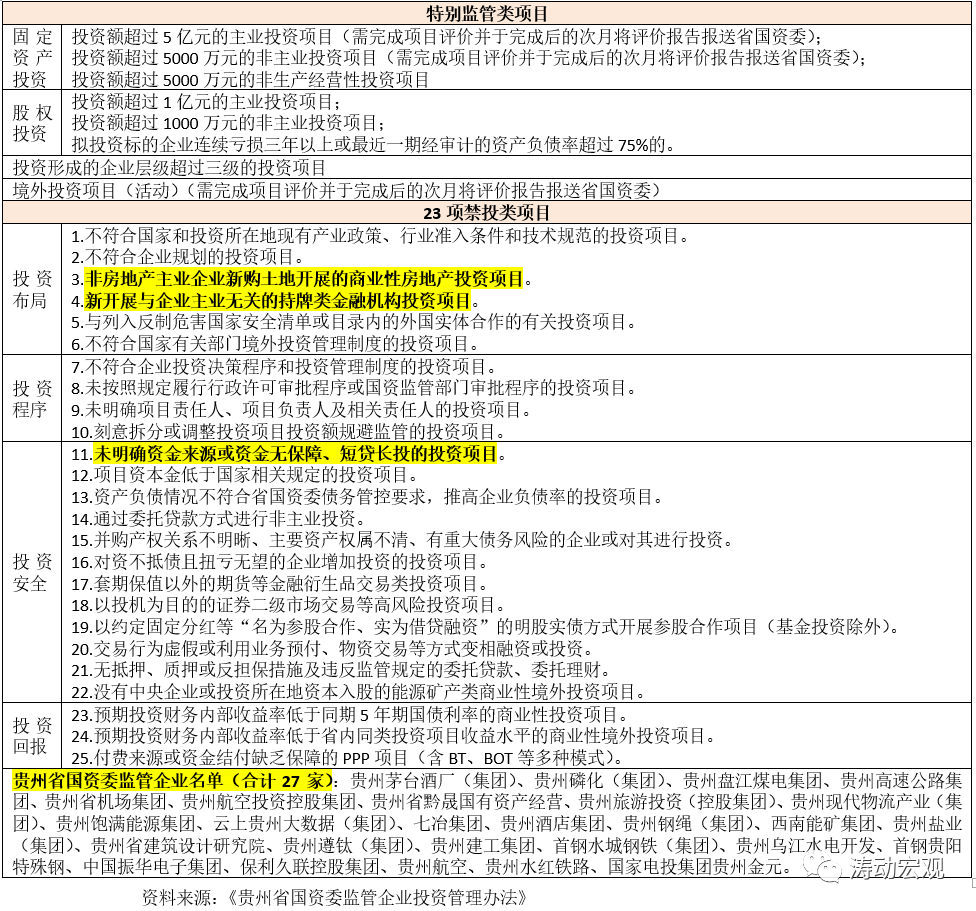 2021年10月26日,貴州省國資委發布了《貴州省國資委監管企業投資管理辦法》,該文件從投資端(即控制住如何花錢)對貴州省國資委監管企業提出了一系列要求,如明確四大類特別監管項目和23項禁投類項目: