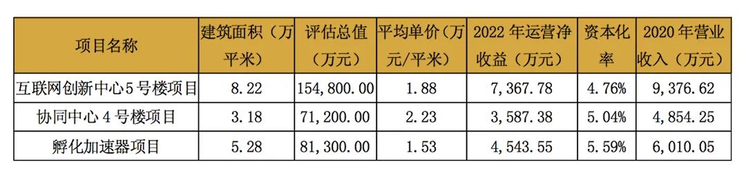 根據(jù)戴德梁行出具的估值報(bào)告,于2021年6月30日,標(biāo)的基礎(chǔ)設(shè)施項(xiàng)目中互聯(lián)網(wǎng)創(chuàng)新中心5號(hào)樓、協(xié)同中心4號(hào)樓及孵化加速器估值分別為15.48億元、7.12億元及8.13億元。
