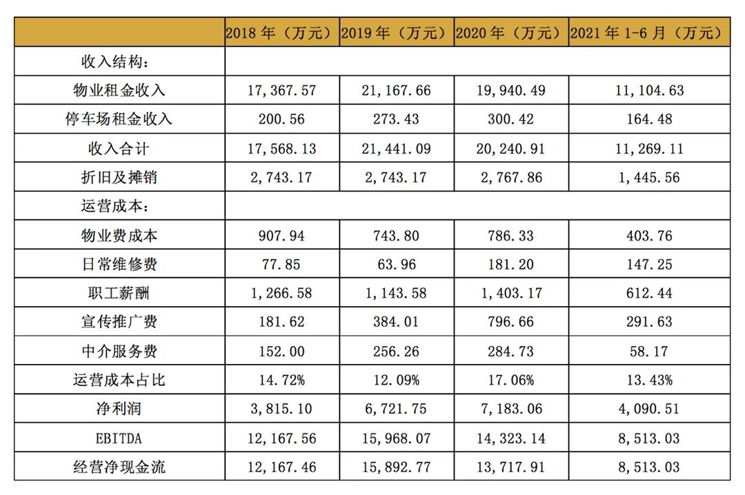 收入方面,2018年、2019年、2020年和2021年1-6月,標(biāo)的基礎(chǔ)設(shè)施項(xiàng)目分別取得租金收入17,568.13萬(wàn)元、21,441.09萬(wàn)元、20,240.91萬(wàn)元和11,269.11萬(wàn)元,其中物業(yè)租金收入占比分別為98.86%、98.72%、98.52%和98.54%,停車場(chǎng)租金收入占比分別為1.14%、1.28%、1.48%和1.46%。