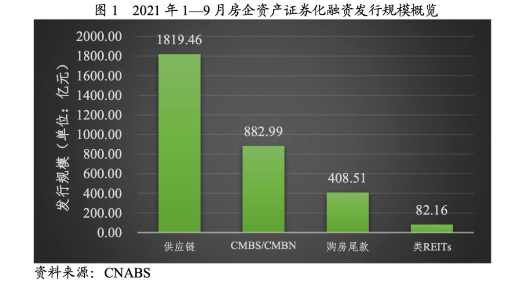 從發行情況來看,2021年1~9月,房企資產證券化產品發行總規模為3418.92億元,同比下降2.59%;其中供應鏈ABS/ABN、CMBS/CMBN、類REITs和購房尾款為最主要的發行品種,發行規模分別為1819.46億元、882.99億元、82.16億元和408.51億元,如下圖所示。