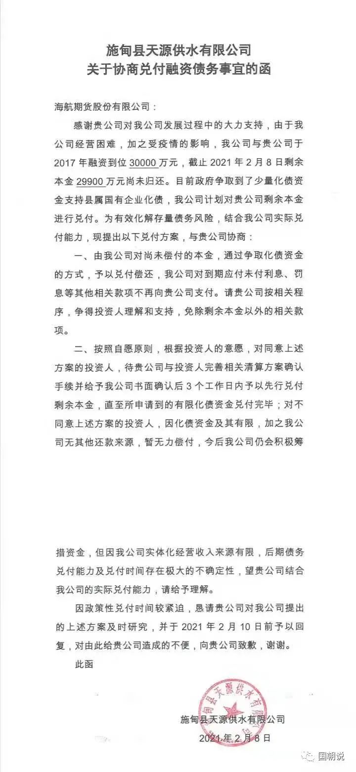 2021年2月8日,施甸縣天源供水有限公司(下稱天源供水)向海航期貨出具的一份《關于協商兌付融資債務事宜的函》。正是這個函,引發了市場的關注,也在此次叩擊著市場對于城投的信仰。