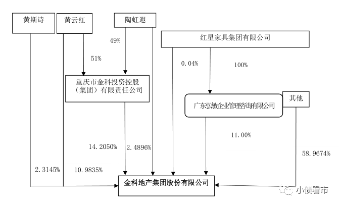 從股權(quán)結(jié)構(gòu)看,創(chuàng)始人黃紅云及其一致行動人陶虹遐和黃斯詩間接和直接合計持有金科股份29.9926%的股權(quán),黃紅云為公司實際控制人。