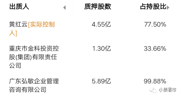 從股權(quán)質(zhì)押上看,截至今年6月末,金科投資、黃紅云及其一致行動人共計質(zhì)押金科股份4.48億股股票,占其所持股份的27.97%;廣東弘敏股權(quán)質(zhì)押率為99.88%。