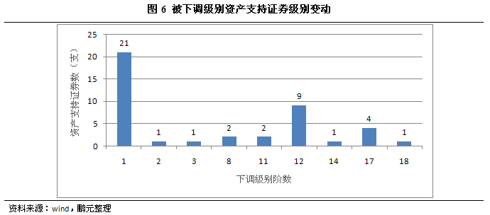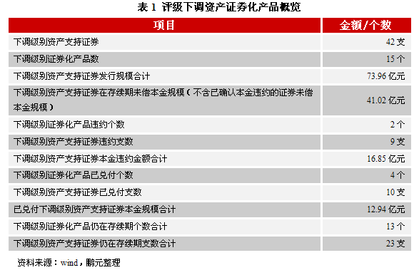 根據wind,截至目前,共有42只資產支持證券發生級別下調,涉及相關證券化產品共15只證券化產品,下調級別的資產支持證券發行規模合計73.96億元,存量規模(不含已確認本金違約的證券未償本金規模)合計41.02億元(見表1及文末附表)。在目前被下調級別的證券化產品中:4個產品已兌付完畢,已有2個產品確認違約[2],其中大成西黃河大橋通行費收入收益權專項資產管理計劃及平銀凱迪電力上網收費權資產支持專項計劃(二期)發生本金違約。級別被下調及已違約資產支持證券本金規模分別占國內證券化市場發行總體規模比例為0.19%及0.04%,占比極小??傮w來看,目前國內證券化市場風險可控。
