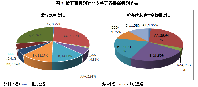 從級別下調程度來看[3],共有21支資產支持證券級別被下調1個級別階數[4],9支資產支持證券級別被下調12個級別階數,4支資產支持證券被下調17個級別階數(見圖6)。被下調資產支持證券的最新級別主要分布于AA、C及B,被下調資產支持證券且仍處于存續期內的資產支持證券級別主要分布于AA、B+及B(見圖6及圖7)??傮w來看,相對于傳統債券,國內資產支持證券被下調級別的數目較少,但單次下調的幅度會高于傳統債券單次下調的幅度,這也是資產支持證券評級與傳統債券評級的主要差異之一(BIS,2005)。