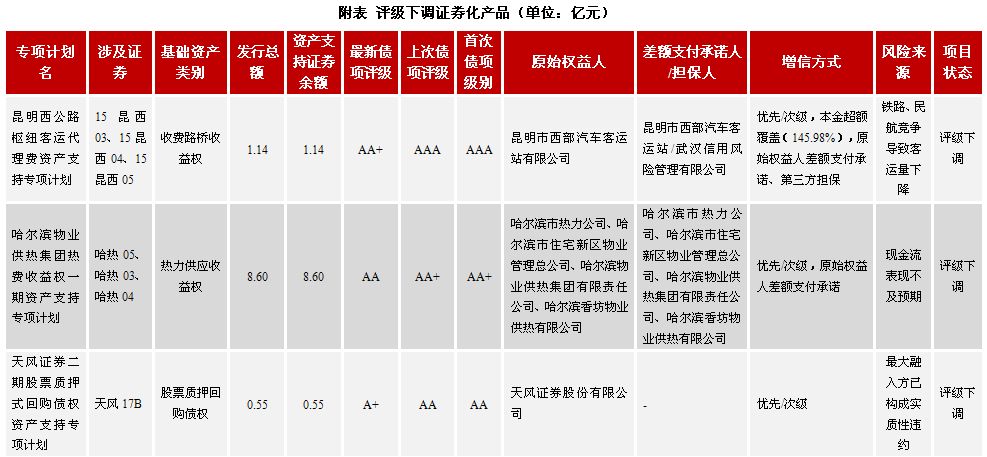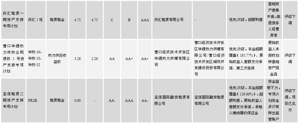 根據公開可獲得信息,我們在表3至表10梳理了目前幾個被下調級別證券化項目的風險事項。總體來看,目前被下調級別的證券化產品風險來源主要可總結為:基礎資產質量下降、差額補償方/擔保方級別下調以及資產服務機構、管理人等其他主要參與主體未盡職及增信措施有效性不足。