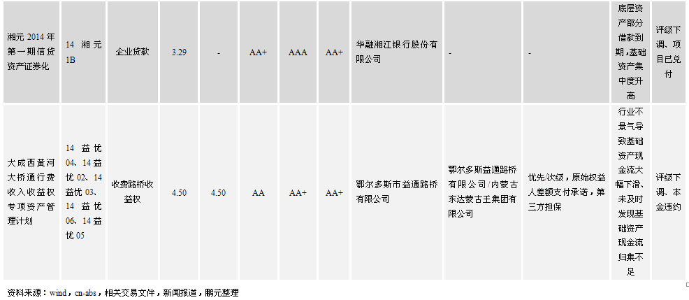 正如前文所述,基礎資產是證券化產品的基礎,基礎資產質量的下降是證券化產品最直接且最主要的風險來源。目前被下調級別的證券化產品中,其基礎資產質量下降的主要原因包括集中度變高及基礎資產現金流惡化。具體來看,湘元2014年第一期信貸資產證券化因底層資產部分借款到期,導致基礎資產集中度升高;大成西黃河大橋ABS因現金流預測過于樂觀加之煤炭行業不景氣,導致基礎資產現金流較預期大幅下滑;永利熱電ABS因主要用熱客戶搬遷導致供熱收入大幅下滑;慶匯租賃ABS因底層債務人經營異常導致基礎資產現金流減少;渤鋼租賃ABS因底層承租人所屬鋼鐵行業景氣度持續低迷且其經營狀況惡化導致其租金支付能力下降。雖然大成西黃河大橋ABS、永利熱電ABS、慶匯租賃ABS級渤鋼租賃ABS基礎資產集中度在存續期間沒有發生變化,但其基礎資產集中度在證券化項目成立時就很高,從而導致了資產池中某一資產現金流的惡化就能對其資產支持證券的償付產生很大影響。
