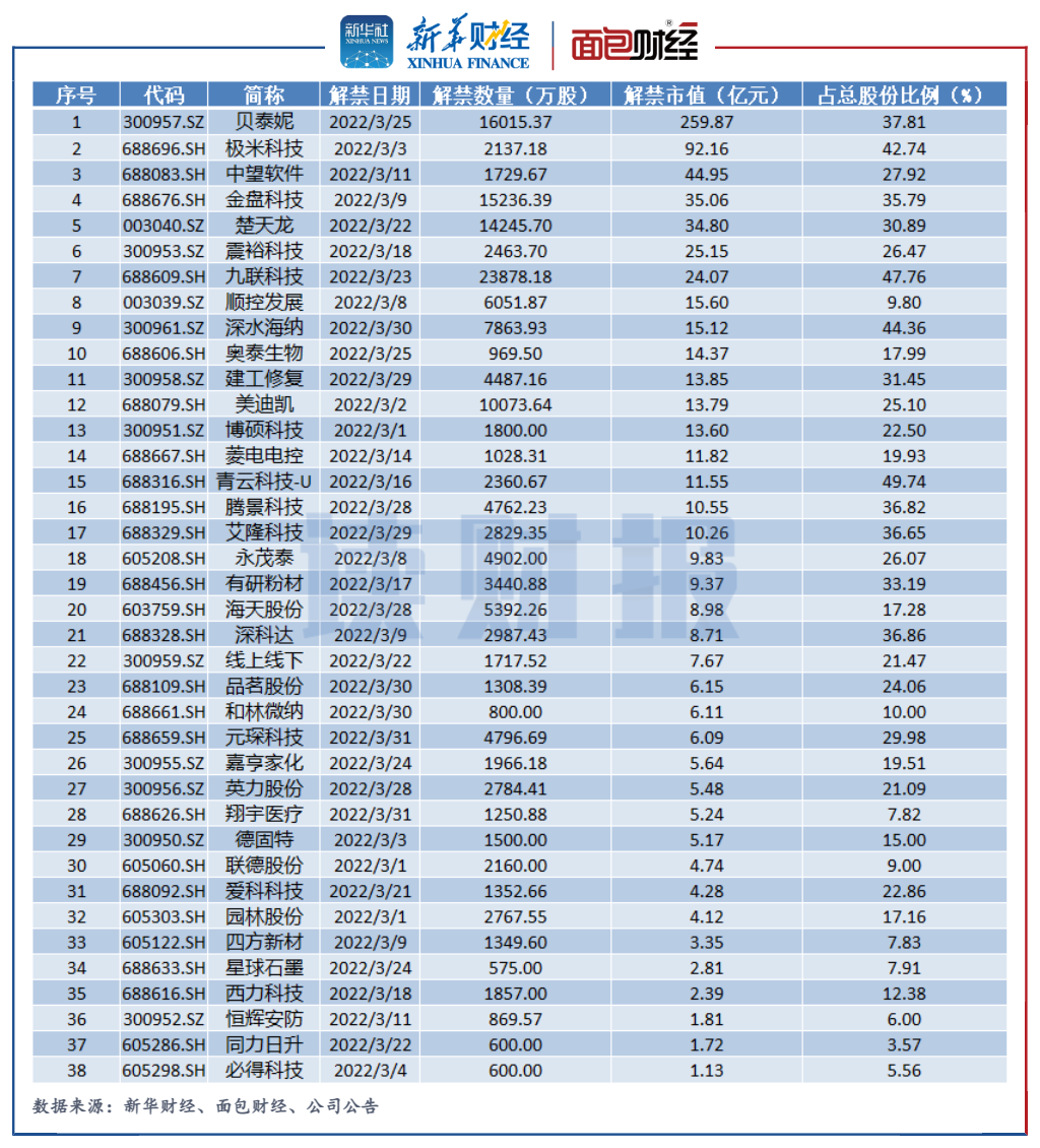 圖3:2022年3月上市周年解禁股名單
