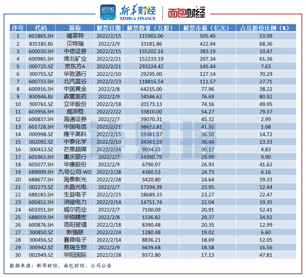 2月多只解禁股股價承壓下行