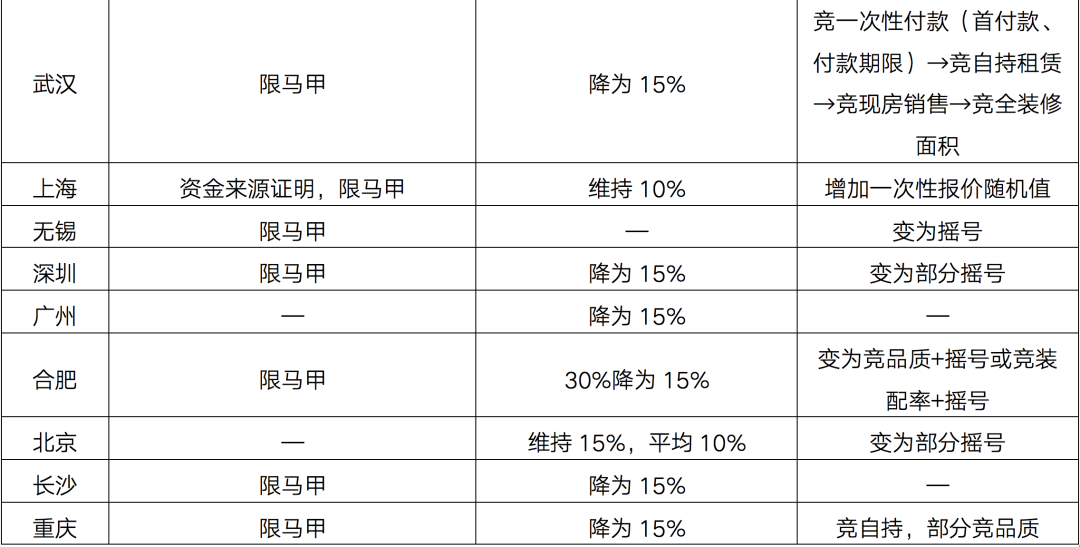第三,達到最高限價后,調整競價方式。青島、沈陽等城市部分地塊采取“限地價、競品質”出讓,杭州、天津、福州單宗住宅用地達到最高限價后,采用搖號方式確定競得人,成都多數地塊在達到最高限價后轉為“競銷售型一類人才公寓面積比例”,上海一次性報價階段增加“隨機值”。