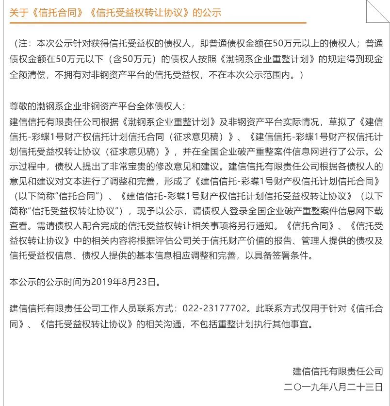 參與信托計劃的債權人或其繼受人依法享有對非鋼資產平臺、信托計劃、受益人大會等知情權。在信托計劃成立之后,債權人或受益人認為有必要對信托計劃調整的,可依據公司法、信托法、信托計劃等規定依法進行調整。