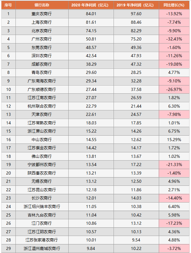 東莞農商行、深圳農商行、成都農商行等9家農商行,凈利潤為20-50億之間,比起前四甲50億元以上的規模,仍有較大差距。其中,廣東順德農商行的降幅最大,同比下降26.97%;