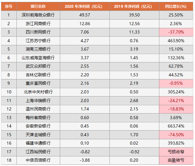 微眾銀行在已披露凈利潤數據的民營銀行之中,凈利潤最大,達到49.57億元,同比增長25.50%;