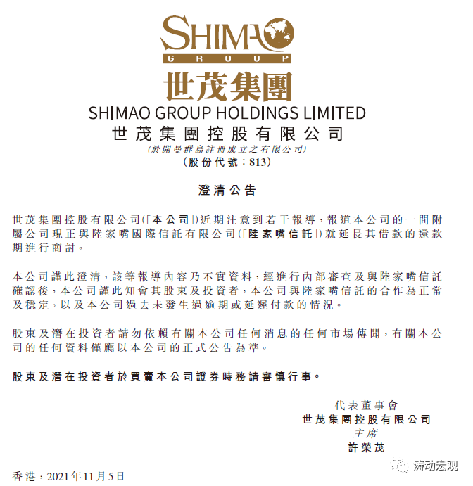 2021年11月4日,網(wǎng)傳“世茂旗下公司正與陸家嘴信托就延長(zhǎng)其借款的還款期進(jìn)行商討”,引發(fā)世茂系股債紛紛大跌。隨后2021年11月5日,陸家嘴信托與世茂相繼發(fā)布澄清公告,并啟動(dòng)對(duì)股票與債券的回購(gòu)舉措。不過,這一傳言還是引起了市場(chǎng)對(duì)世茂基本面的關(guān)注,表明其流動(dòng)性情況有一定程度的緊張。