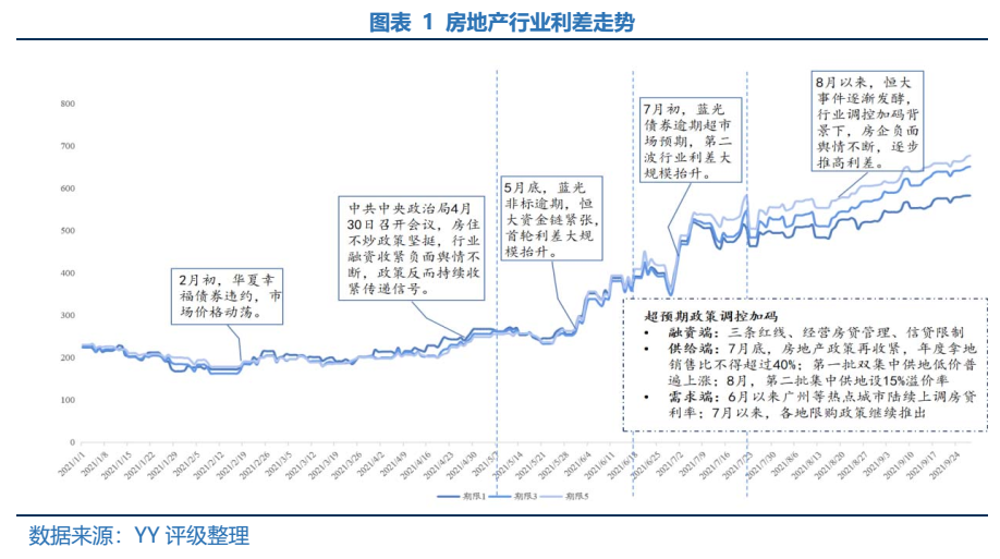 政策調控背景下,華夏幸福、藍光以及恒大等主體負面輿情不斷,7月以來,接連負面輿情釋放導致行業局面持續悲觀,而政策繼續加碼,負面情緒釋放進一步推高利差走擴,而隨著花樣頻出,市場的信心仍在進一步下墜中。