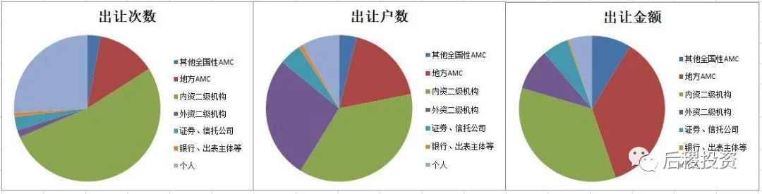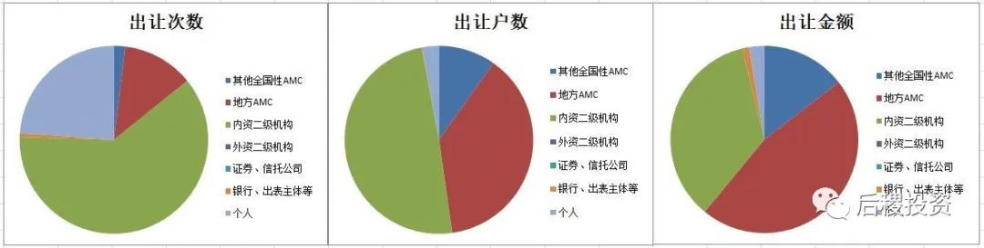 在出讓去向上,內資二級機構和地方AMC為主要合作方,二者合計占總出讓次數和戶數的一半以上,占總出讓金額的70.86%,其中內資二級機構和地方AMC的份額旗鼓相當,與地方AMC的合作較為密切,外資二級機構占比9.16%也大幅領先其他全國性AMC。