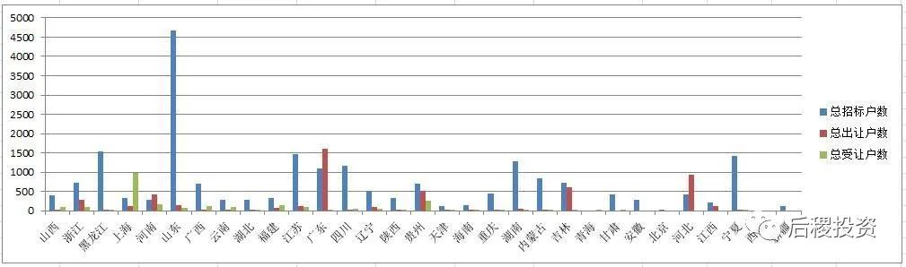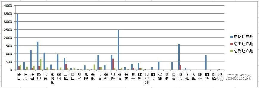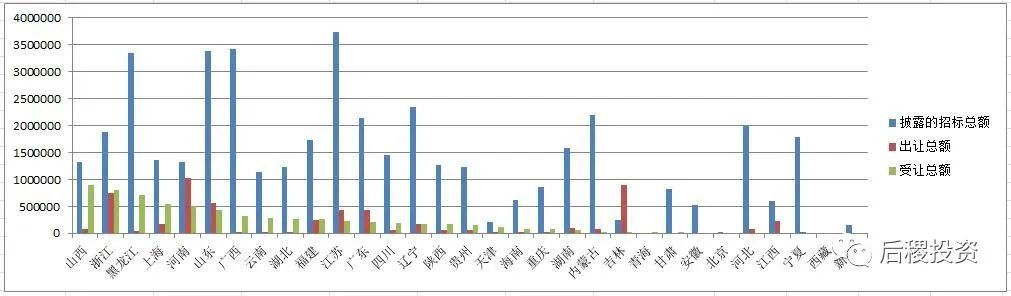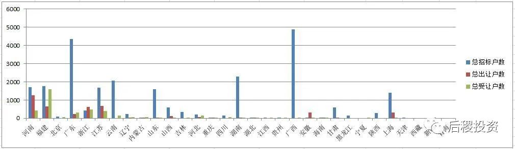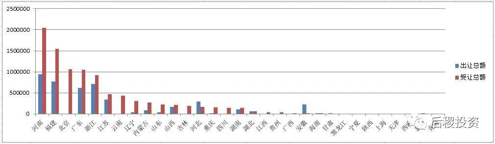 從招標次數上看,東方招標最多的省份依次是江蘇、浙江、山東、廣東和福建,而從戶數上看依次是廣西、廣東、云南、湖南和福建,從披露金額債權標的的總債權額看,依次是福建、廣東、江蘇、山東和浙江,造成這種不一致的原因在于招標資產包的性質不同,戶數多而金額少的可能是持有時間比較久的債權資產,比如廣西有兩個債權資產包,戶數分別是1872筆和2384筆,但總金額只有25.74億和36.94億元,可能屬于積壓債權的例行公告催收,亦可能是加大了處置力度。而單從成交金額情況上看,河南、福建、浙江、廣東和江蘇不論在出讓還是在受讓上,均是成交的重點地區,在北京、云南、遼寧、內蒙古和山東地區側重于收包,而在安徽地區則側重于出讓。
