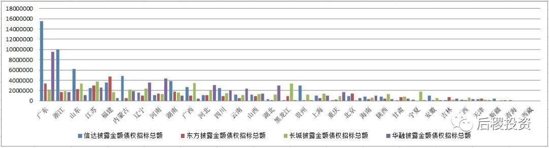 四大的總招標規模最多的省份前五是廣東、浙江、山東、江蘇和福建,但各AMC的側重點各有不同,華融和信達占了廣東省債權招標的絕大多數。事實上信達在各個省份的招標規模均處在前列,在廣東、浙江、江蘇、內蒙古、湖南和貴州均接近半數。華融在廣東、遼寧、河南、河北、云南、湖北的招標相對其他AMC較多,東方在福建、江蘇的招標規模領先,長城則在全國各地招標規模比較均衡。