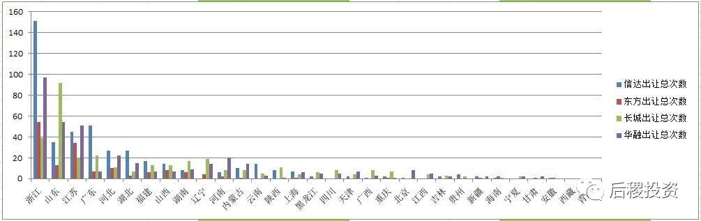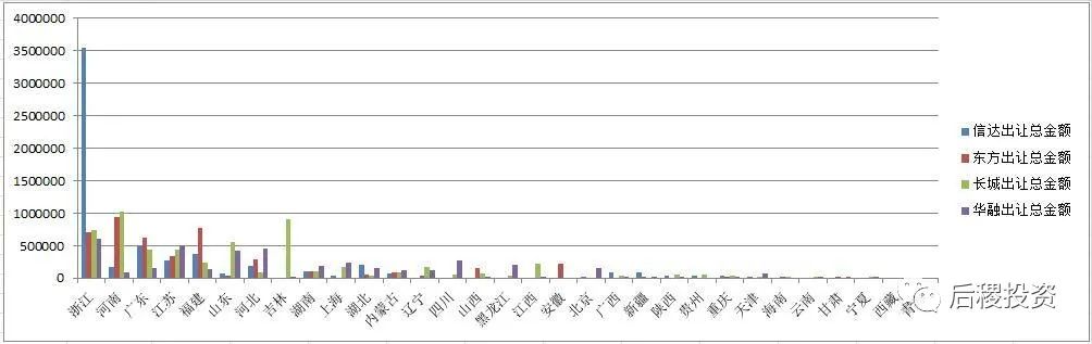 在出讓規模上,前五的省份依次是浙江、河南、廣東、江蘇和福建。其中信達在浙江的出讓規模尤其出眾,而浙江的出讓成交總規模也遠遠高出其他省份,屬當之無愧的最活躍市場。長城和東方在河南市場的出讓規模居前,而在廣東和江蘇市場,華融、長城和東方的表現接近。