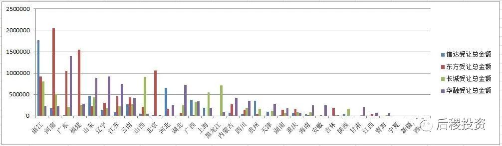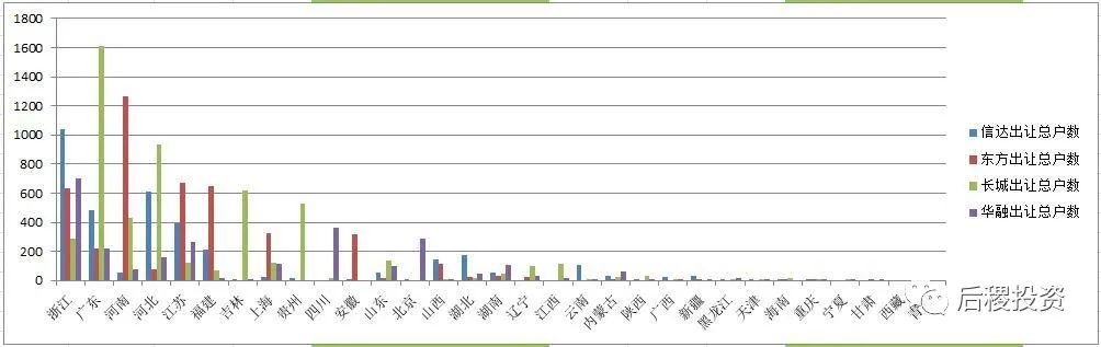 從華融的招標次數上看,排前五的是浙江、江蘇、山東、四川和廣東,而從戶數上看排前五的是廣東、河南、江蘇、北京和山東,而從金額上看,廣東、河南、遼寧、河北和湖北。從成交情況上看,浙江、江蘇和山東的招標和出讓對比情況,較其他地區更好。華融受讓前五的省份依次是廣東、遼寧、山東、江蘇和湖北,另外內蒙古、浙江、四川、廣西和云南也較其他地區為好,而出讓上,則以浙江、江蘇、河北、山東、四川為主,亦可以看出受讓往西南地區偏移的傾向,但受讓的重點還是在廣東地區和遼寧地區,這與其他三大AMC明顯不同。