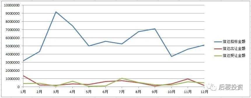 信達的招標次數在全年體現出一種較為平緩的波浪線,即在每月130左右上下浮動,招標戶數和金額在3月份出現了一次大的波動,總體來說全年較為均衡。出讓次數較受讓次數高出一個水平,但出讓金額和受讓金額的全年曲線出現了糾纏,這是因為,信達有很大一部分債權標的的公告信息并未透露債權金額,如將這部分金額考慮進去,則全年的出讓金額曲線應該與戶數或次數曲線一致,出讓金額曲線高于受讓金額曲線一個水平。而從曲線幅度上看,信達全年各月的出讓與受讓情況較為平均。
