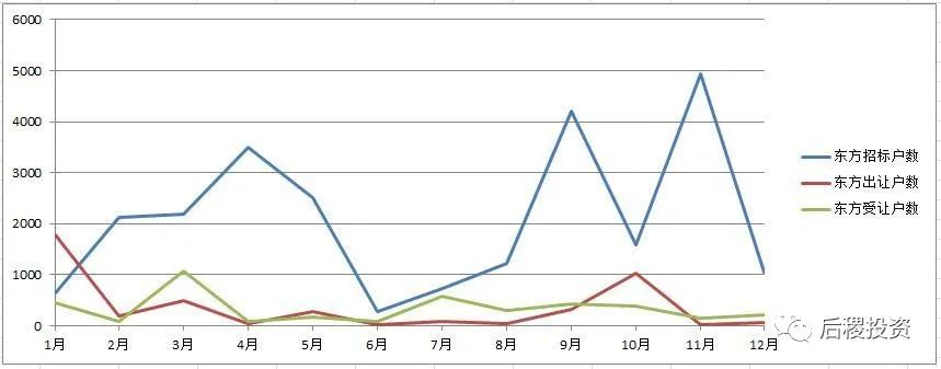 東方的招標規模在2019年4季度出現了一個大的攀升,而招標曲線與出讓、受讓曲線的高度,較信達并未表現得差距過于巨大。去年7月份是東方受讓的高峰期,由于公告期較實際招標期有時間間隔,故實際的受讓高峰期應當是6月份。